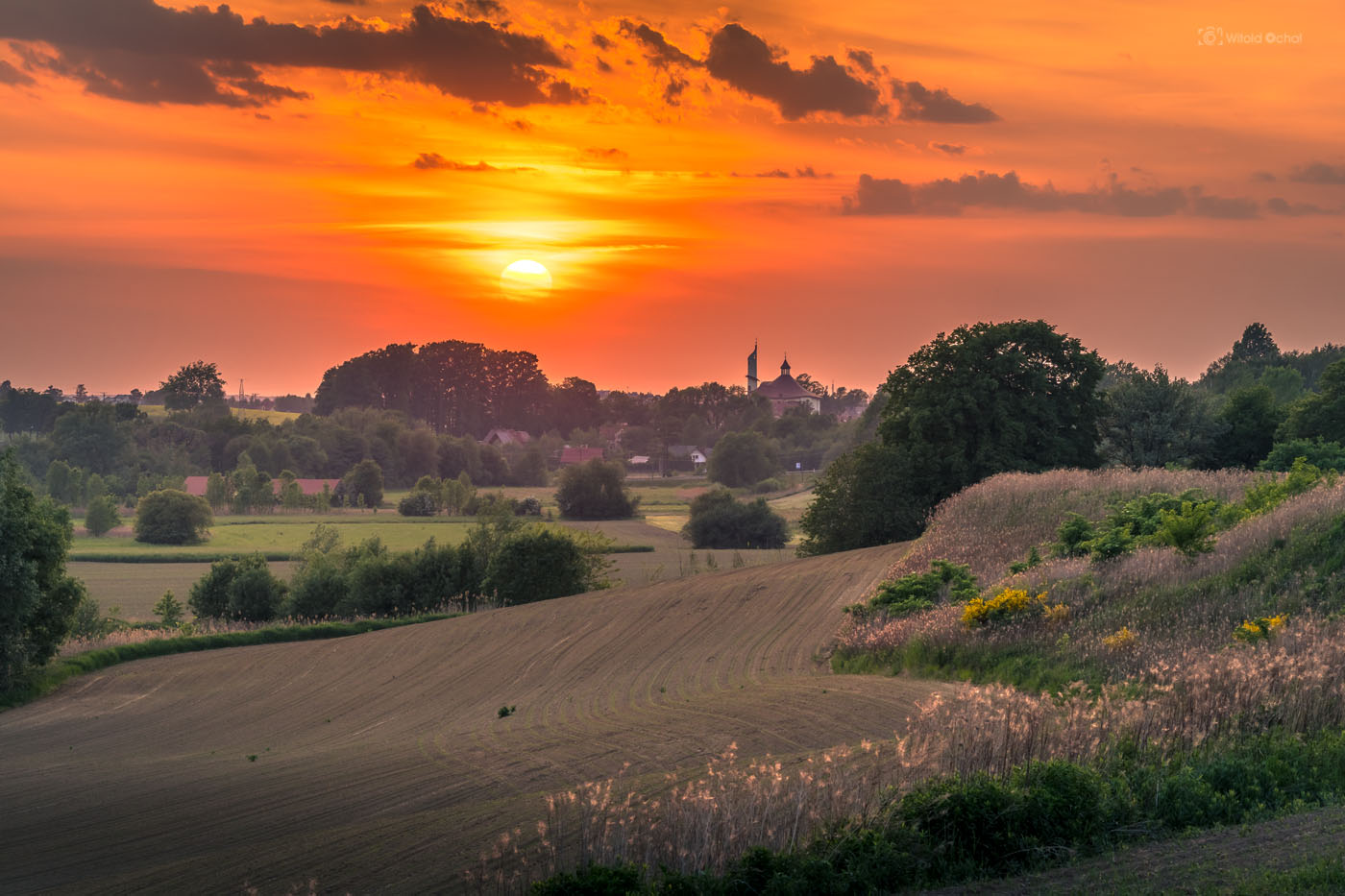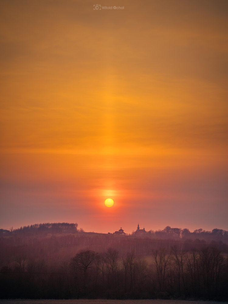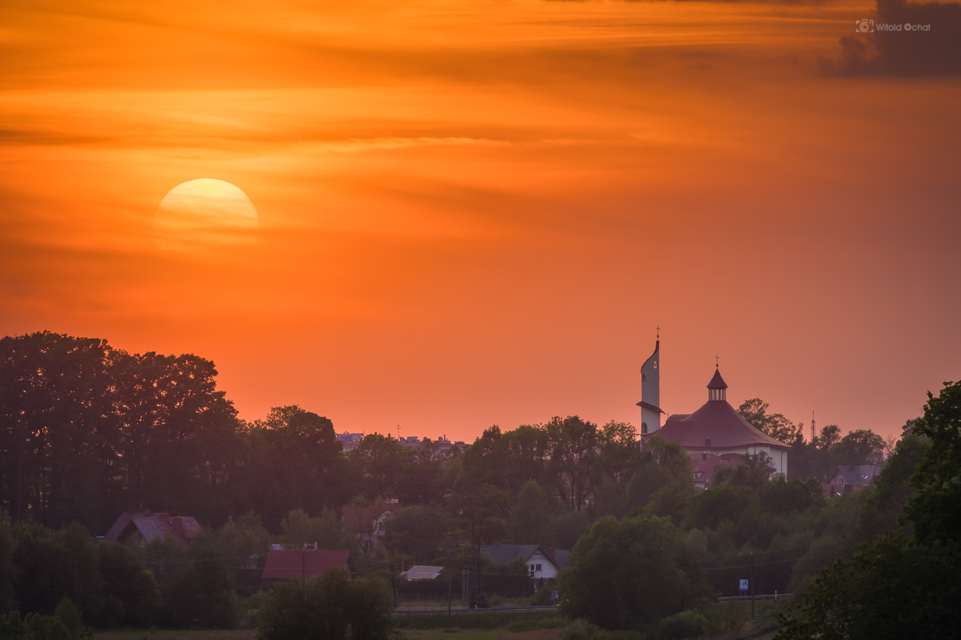Faktycznie, niebo jest pomarańczowe nad horyzontem. Jednak słońce chowa się w ten zawieszony nisko pył jeszcze kilka stopni nad ziemią, co uniemożliwia mi zrobienie zbliżenia na kościół z zachodzącą za nim kulką. Wcześniej udaje się jednak zrobić kilka fotek, a ostatnie już po zachodzie słońca, podczas niebieskiej godziny.