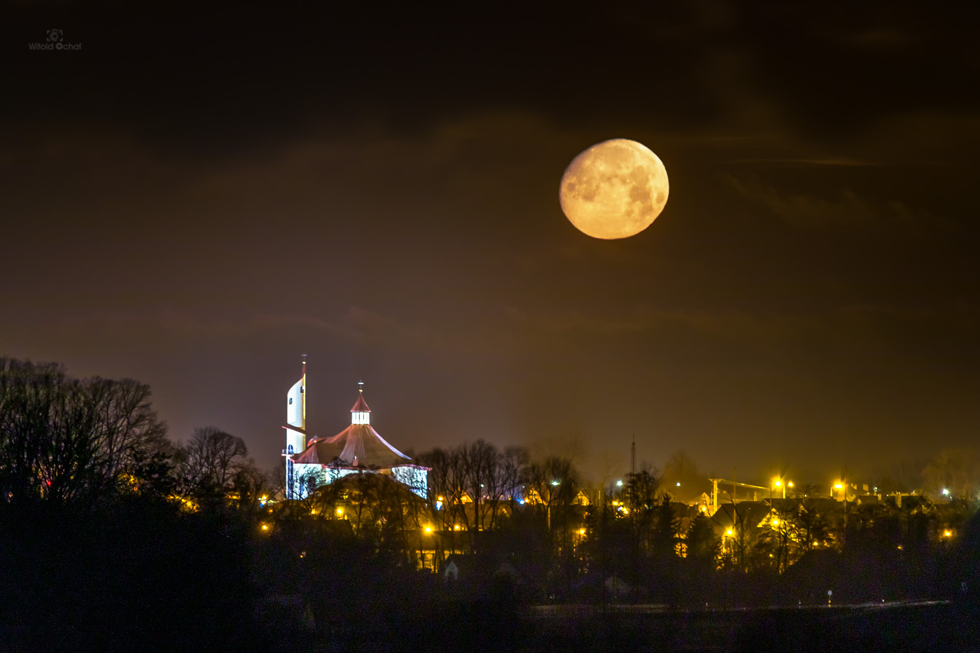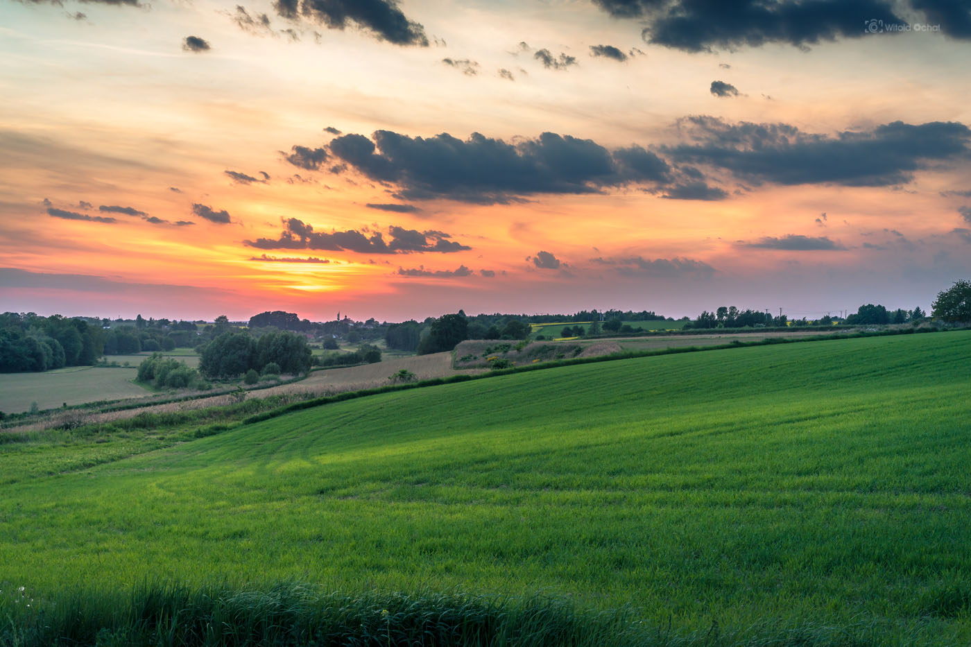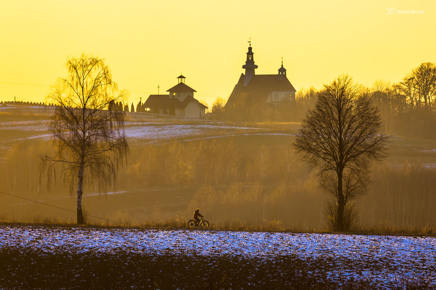 Faktycznie, niebo jest pomarańczowe nad horyzontem. Jednak słońce chowa się w ten zawieszony nisko pył jeszcze kilka stopni nad ziemią, co uniemożliwia mi zrobienie zbliżenia na kościół z zachodzącą za nim kulką. Wcześniej udaje się jednak zrobić kilka fotek, a ostatnie już po zachodzie słońca, podczas niebieskiej godziny.