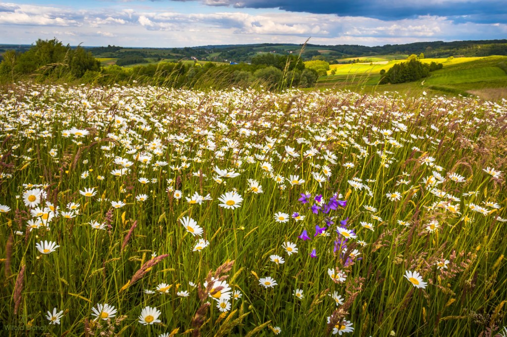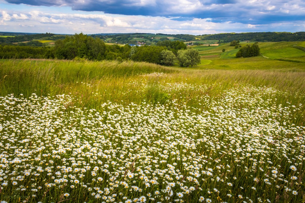 Czerwiec, to czas, kiedy łąki porastają polnymi kwiatami. Ja trafiłem na łąkę, która z zielonej zmieniła się w białą. A sprawił to jastrun właściwy (Leucanthemum vulgare).