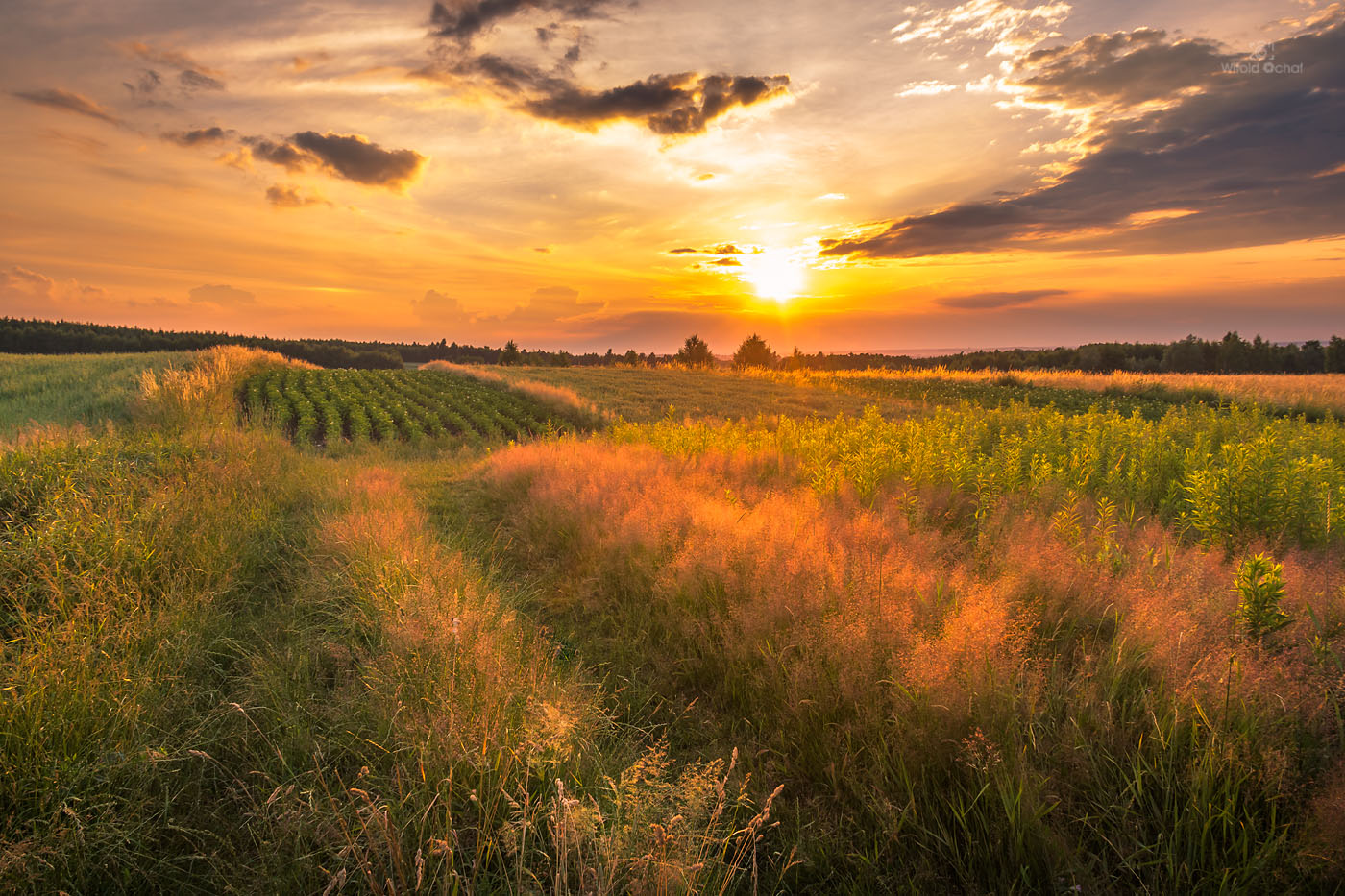 Złocące się w słońcu trawy mogły by wskazywać na jesień. Nic bardziej mylnego, to pełnia lata i jeden z wieczorów, kiedy to zachodzące słońce dyktuje modne kolory. Przez te kilkanaście, czasem kilkadziesiąt minut każdego wieczoru to ono jest dyktatorem mody na okolicznych polach i łąkach.
