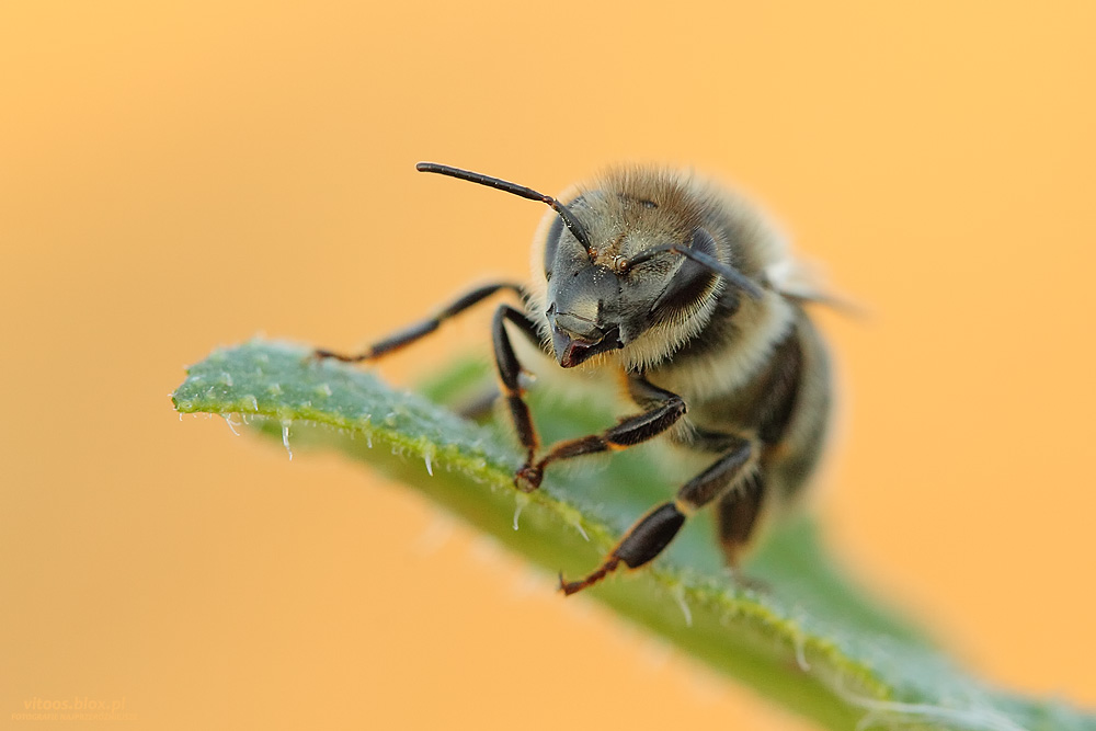 Zimno, ponuro i owadów jak na lekarstwo. Tą zbłąkaną pszczółkę spotkałem na liściu przydrożnego chwastu. Była ospała i apatyczna. Sądziłem, że to jej ostatnie godziny Jakież było moje zdziwienie, kiedy po krótkiej sesji dynamicznie wzbiła się w powietrze.
