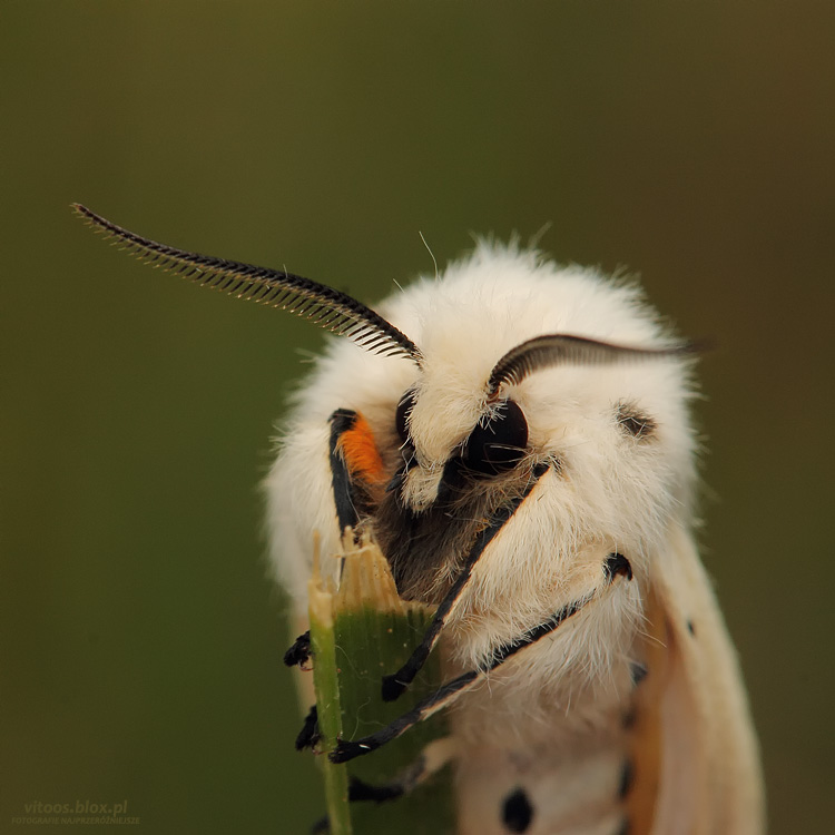 W gęstej trawie nad stawem coś się zabieliło, podszedłem bliżej, a to ćma przybrana w puchate futerko. Na szczęście jak to ćma, była dosyć zaspana i była na tyle uprzejma, że pozwoliła się obfotografowywać do woli.