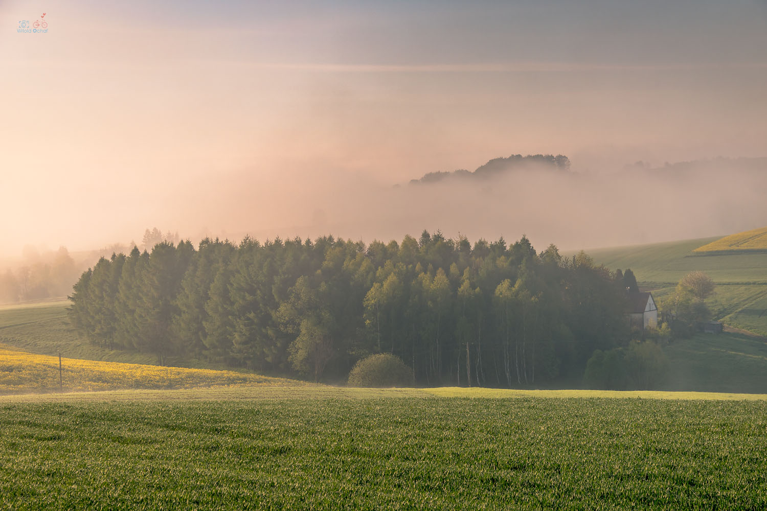 W weekendową sobotę postanowiłem przywitać wschód słońca. Nie wiedziałem, gdzie mnie zastanie. Po prostu jeszcze przed świtem wsiadłem na rower i jechałem przed siebie. Z okolicznych wzgórz dane mi było podziwiać cudowną żółtą kulkę wyłaniającą się zza horyzontu spowitego morzem mgieł. Widok jak dla mnie wręcz hipnotyzujący.