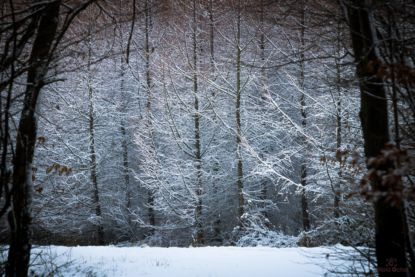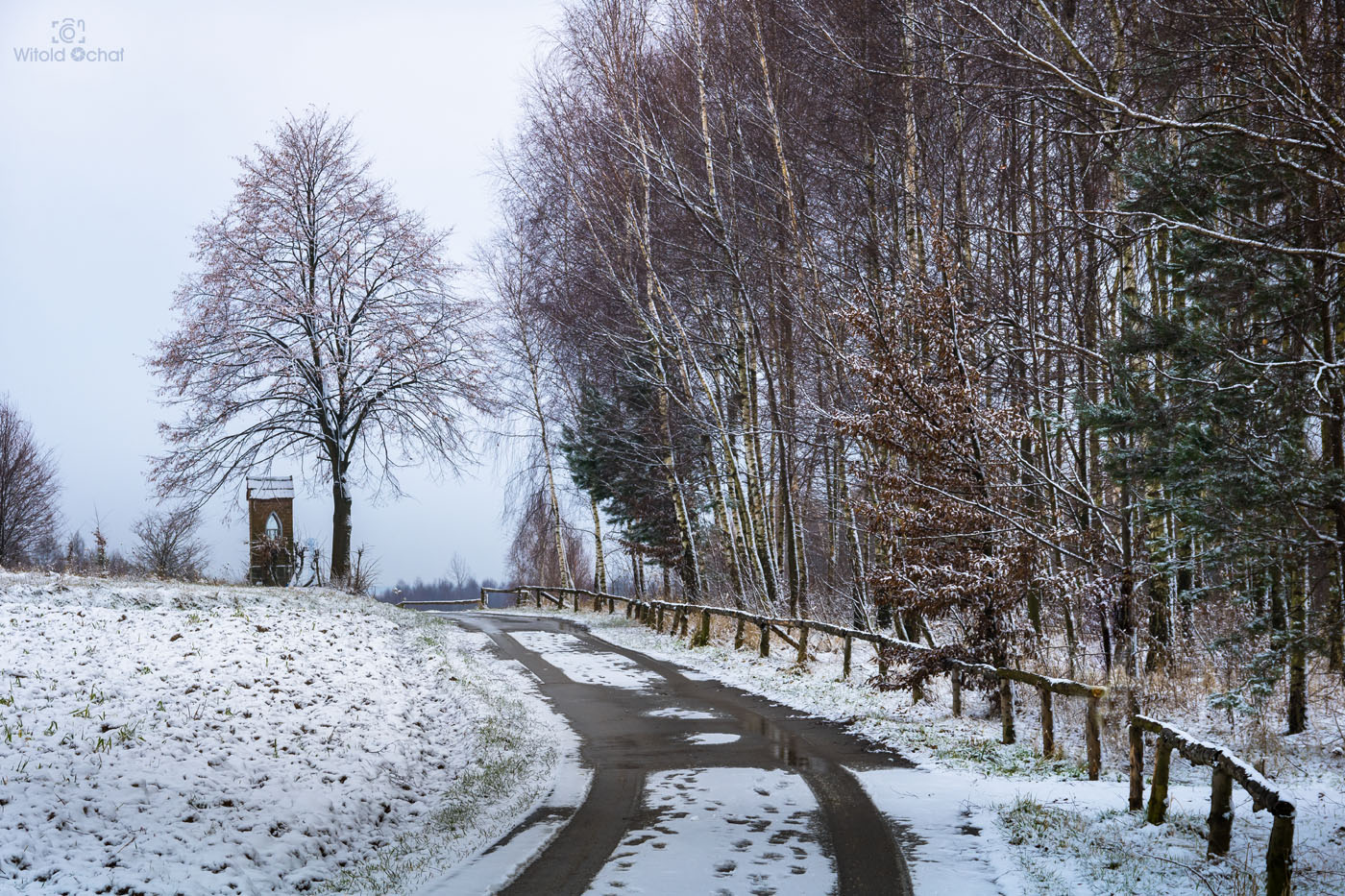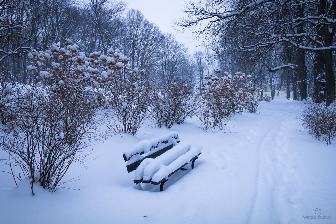 Wstałem przed świtem. Ale to nic nowego w weekendy. Po nocy śniegu jeszcze przybyło. Na drogach (na szczęście odśnieżonych) pusto, bo kto w niedzielę wstaje o takiej porze. Pojechałem na gościnne występy do parku Zespół Parkowo Dworskiego i Folwarcznego w Wiśniowej. Cóż, szczerze mówiąc park ten o wiele lepiej prezentuje się choćby jesienią, ale skoro już tam byłem, to brnąc w śniegu zrobiłem kilka pocztówek na pamiątkę.