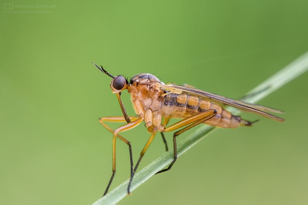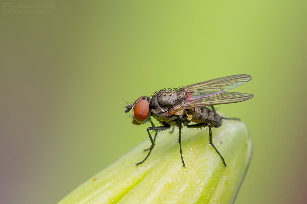 Warunki do fotografowania takie sobie, bo ciemno. Na liściu rododendrona często spotykam spacerujące błysklenie. Tym razem spostrzegłem parkę. Były na tyle pochłonięte robotą, że mogłem pstrykać do woli, no i jedno ze zdjęć mimo szarówki wyszło nie najgorzej.