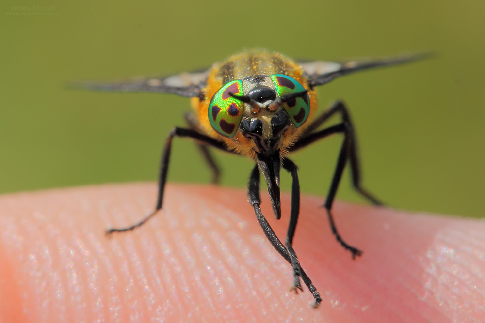 Robiłem zdjęcia jakiemuś owadowi, kiedy na dłoni wylądowało coś dużego i kolorowego. I tym czymś kolorowym zaczęło na mnie patrzeć. Zrobiłem kilka zdjęć, a przeciwnik szybko odleciał niezainteresowany moją krwią… Atakującym okazał się ślepak pospolity (Chrysops caecutiens).