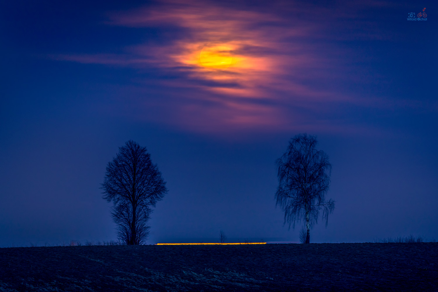 Wracając do wieczoru ze zdjęcia. Sam dojazd jak najbliżej miejscówki był utrudniony przez jeszcze całkiem sporą ilość śniegu na polnych drogach. Całe szczęście, że w porę odpuściłem i resztę drogi postanowiłem pokonać pieszo, bo mogłem tam utknąć w zaspach razem z autem. Ubrany na cebulkę ustawiłem aparat i czekałem z niecierpliwieniem na Księżyc. Plan był złpać go dokładnie pomiędzy kominem rzeszowskiej elektrowni, a wysokim na sto dziesięć metrów i odległym ode mnie o dziesiąć kilometrów pylonem mostu Mazowieckiego. Mimo trudnych warunków udało się wykonać fotografię, wrócić do domu, poddać ją postprodukcji i dopiero wtedy zapaść na choróbsko. Publikacja musiała poczekać do dzisiaj.
