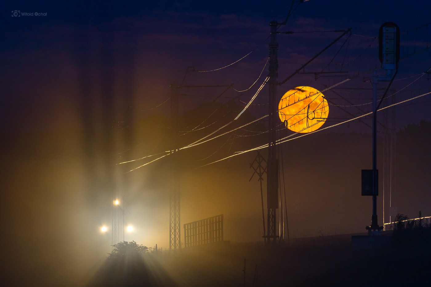 Trzecia fotka ma nieco inna historię. Powstała na stacji PKP w gęstej mgle. Docelowo miała być naświetlania co najmniej minutę, ale po sześciu sekundach rozładowała się bateria i powstała mroczna fotka z delikatnie zaznaczonym śladem świateł pociągu.