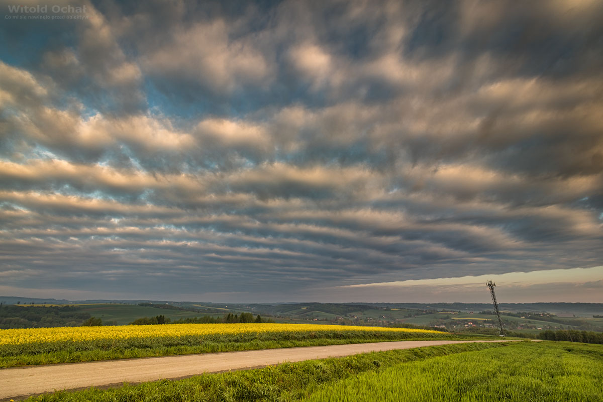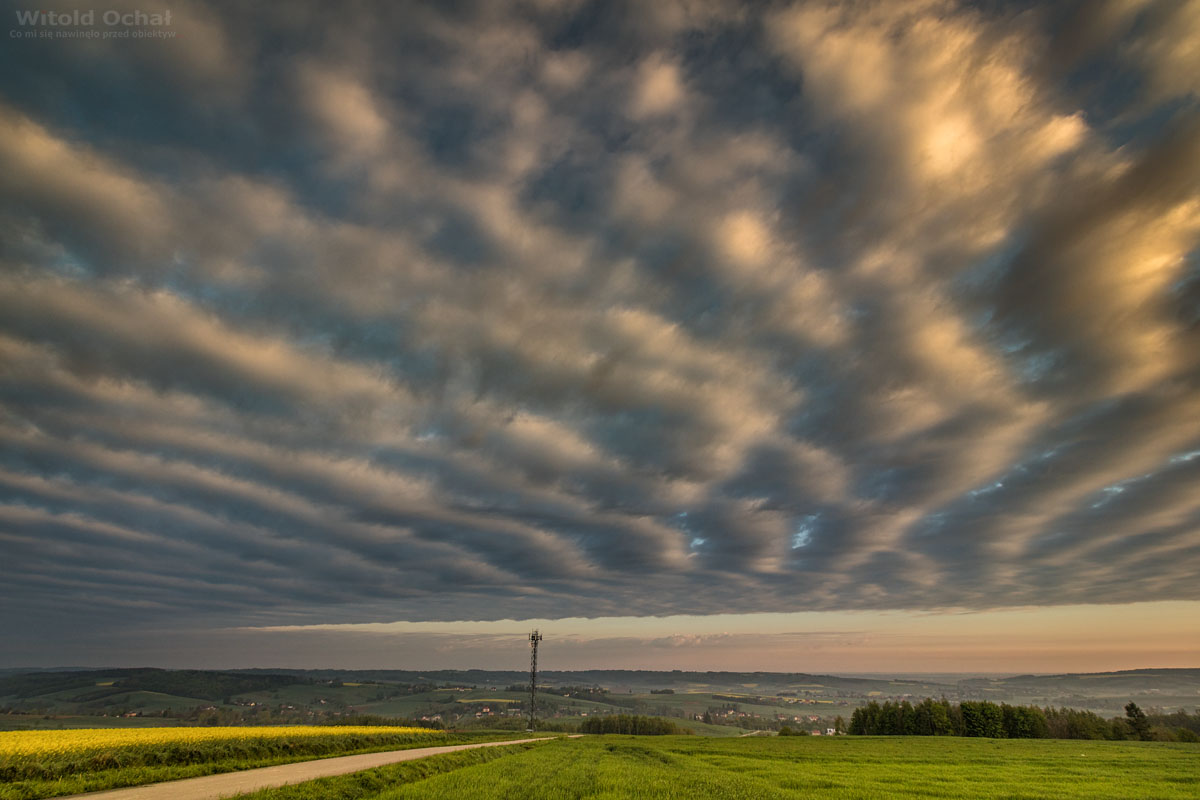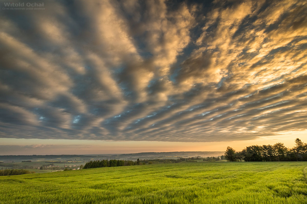 Wyjeżdżam na jedno z wyższych wzniesień w mojej okolicy. Słońce wstało kilkadziesiąt minut temu. Nad zachodnią stroną horyzontu rozpościerają się okazałe pasiaste chmury podświetlone od dołu słońcem. To książkowy przykład chmur altocumulus stratiformis undulatus. Piękniejszego poranka nie mogłem sobie wymarzyć.