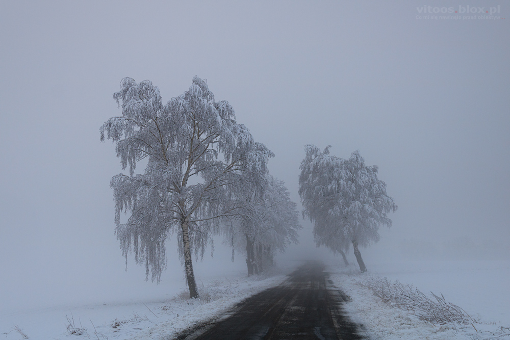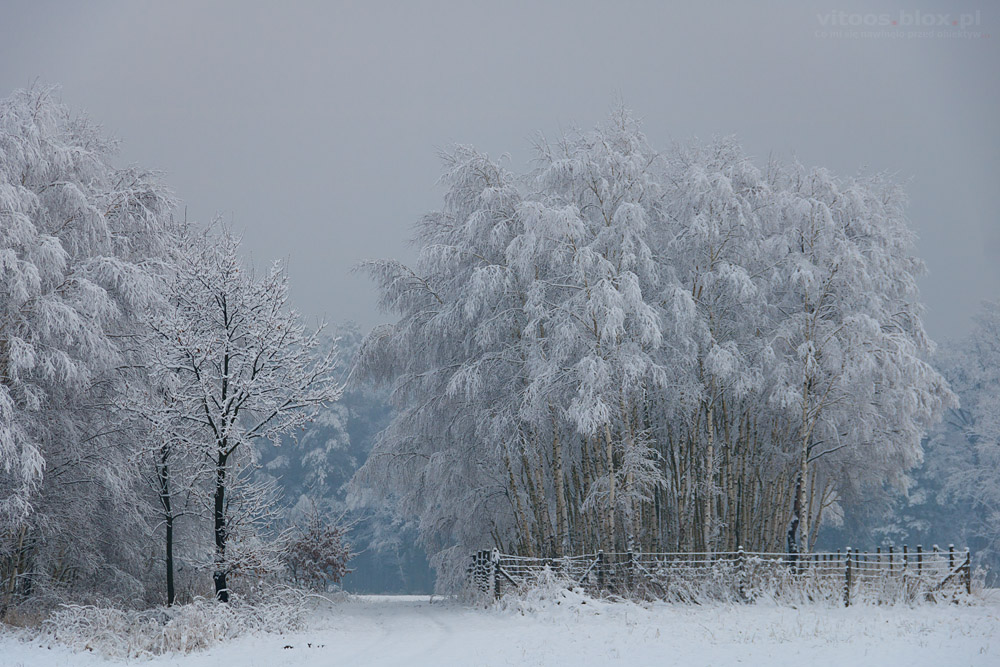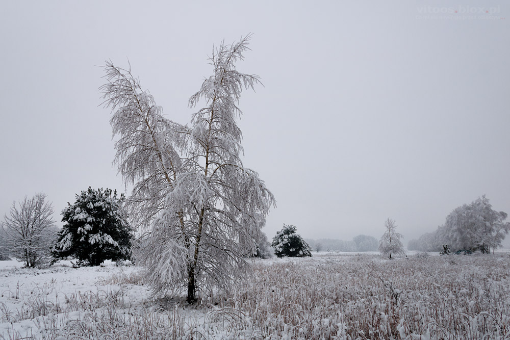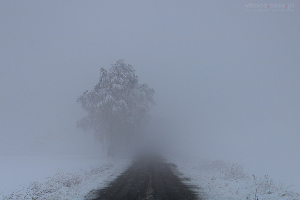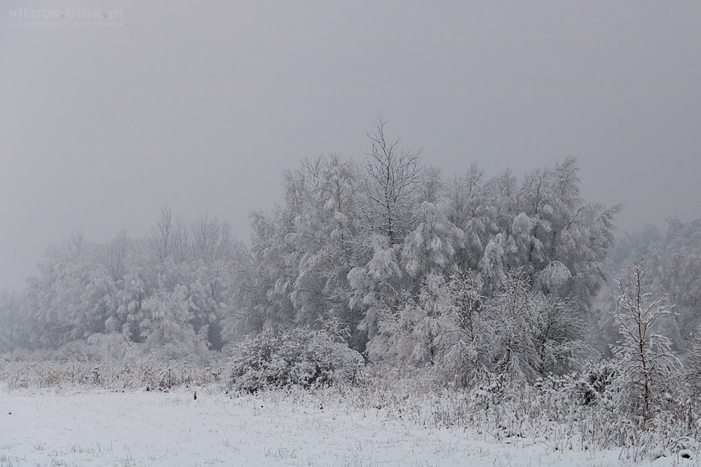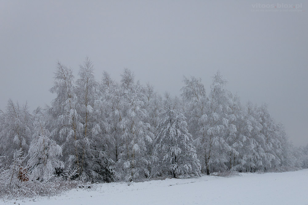 Wczoraj od popołudnia sypał śnieg. Temperatura oscylowała w okolicy 0° C i bałem się, że do rana nie będzie po nim śladu. Na szczęście rano zastałem bajkowy krajobraz. Drzewa oblepione śnieżną pierzynką, a miejscami do tego gęsta mgła. Dziś pierwsza porcja zdjęć w dzisiejszego poranka.