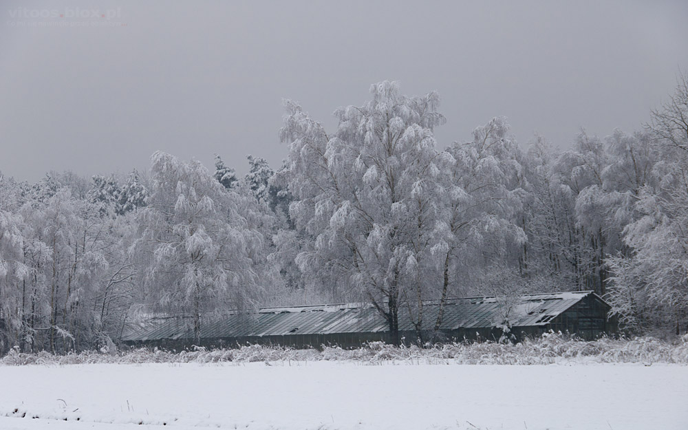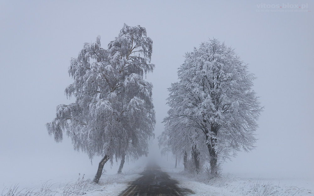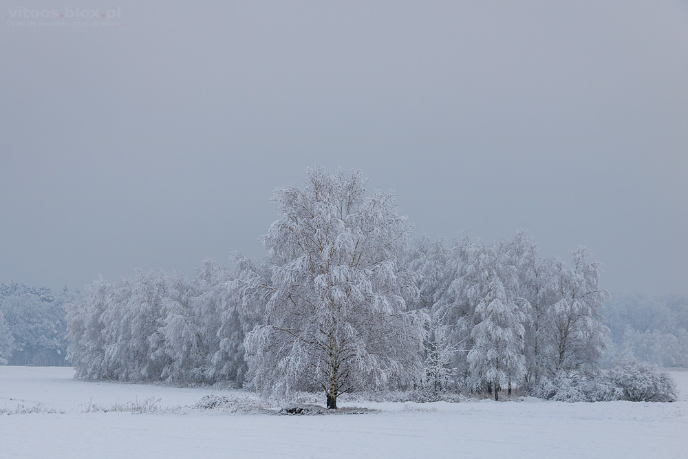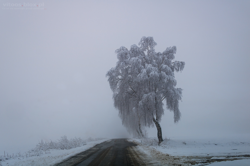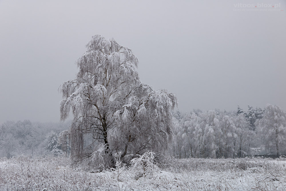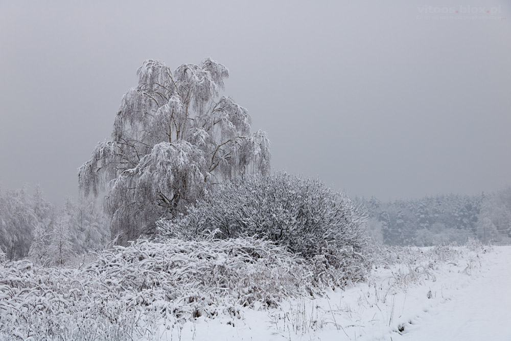 Wczoraj od popołudnia sypał śnieg. Temperatura oscylowała w okolicy 0° C i bałem się, że do rana nie będzie po nim śladu. Na szczęście rano zastałem bajkowy krajobraz. Drzewa oblepione śnieżną pierzynką, a miejscami do tego gęsta mgła. Dziś pierwsza porcja zdjęć w dzisiejszego poranka.