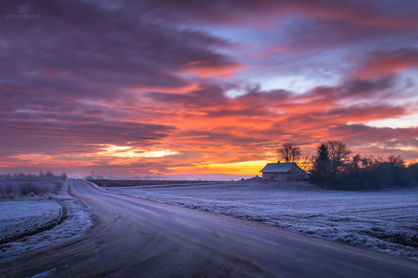 FOT. WITOLD OCHAŁ POWIAT ROPCZYCKO-SĘDZISZOWSKI FOTOGRAFIA KRAJOBRAZOWA PODLASEK KOLOROWY PORANEK ŚWIT CZERWONE NIEBO KRZYŻ