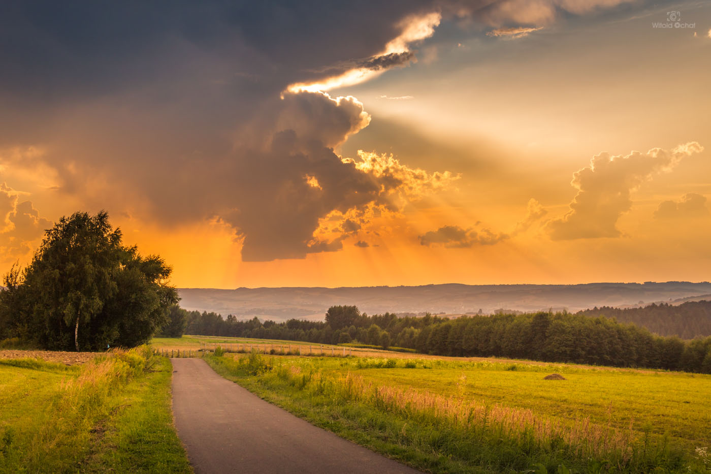 Co prawda chmur było bez liku, ale coś mnie tknęło, że może znajdzie się jakaś mała luka, z której spłyną widowiskowe promienie… Tym razem zastałem na niebie dokłądnie to, co sobie wcześniej wyobraziłem. Była to szybka akcja. Wysiadłem z auta, zrobiłem kilka kroków, pstryknąłem fotkę i miałem już to co chciałem.