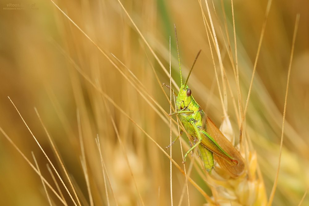 Nigdy nie miałem szczęścia do fotografowania koników. Jak siedziały spokojnie, to ciężko było je zauważyć. Jak skądś skoczyły, to wtedy i owszem, zauważyłem, ale zazwyczaj siadały w miejscu niedostępnym do sfotografowania. Tak było i tym razem. Konik wskoczył w gęste zboże, ale na zdjęciu okazało się, że całkiem fajnie się w nim komponuje.
