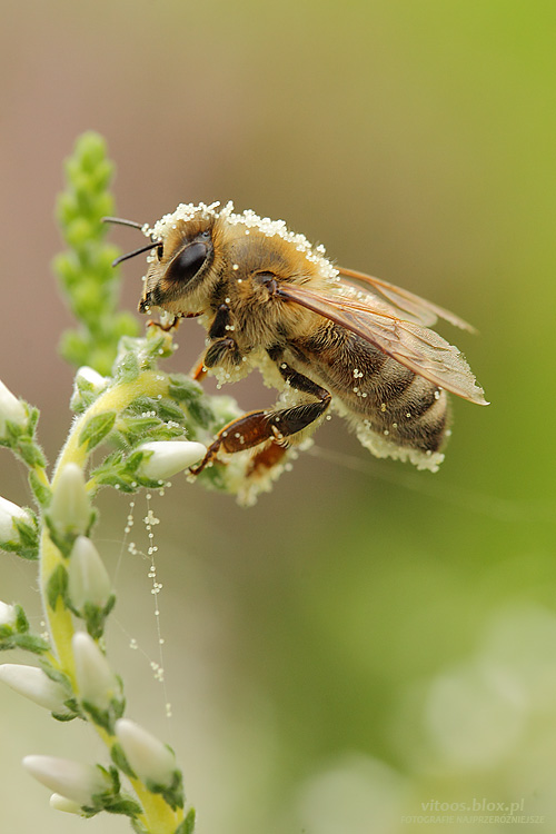 Pod koniec sierpnia wrzosy kwitły już pełną parą. Okoliczne pszczoły miały raj na ziemi. Nie wydaje mi się, żeby jednak ten pyłek, w którym utarzała się ta pszczółka pochodził z wrzosa. Wydaje mi się, że chwilę wcześniej pracowała na kwiatach hibiskusa.