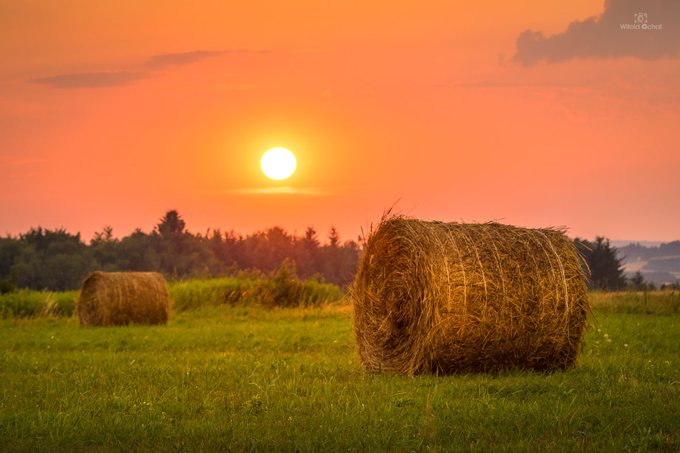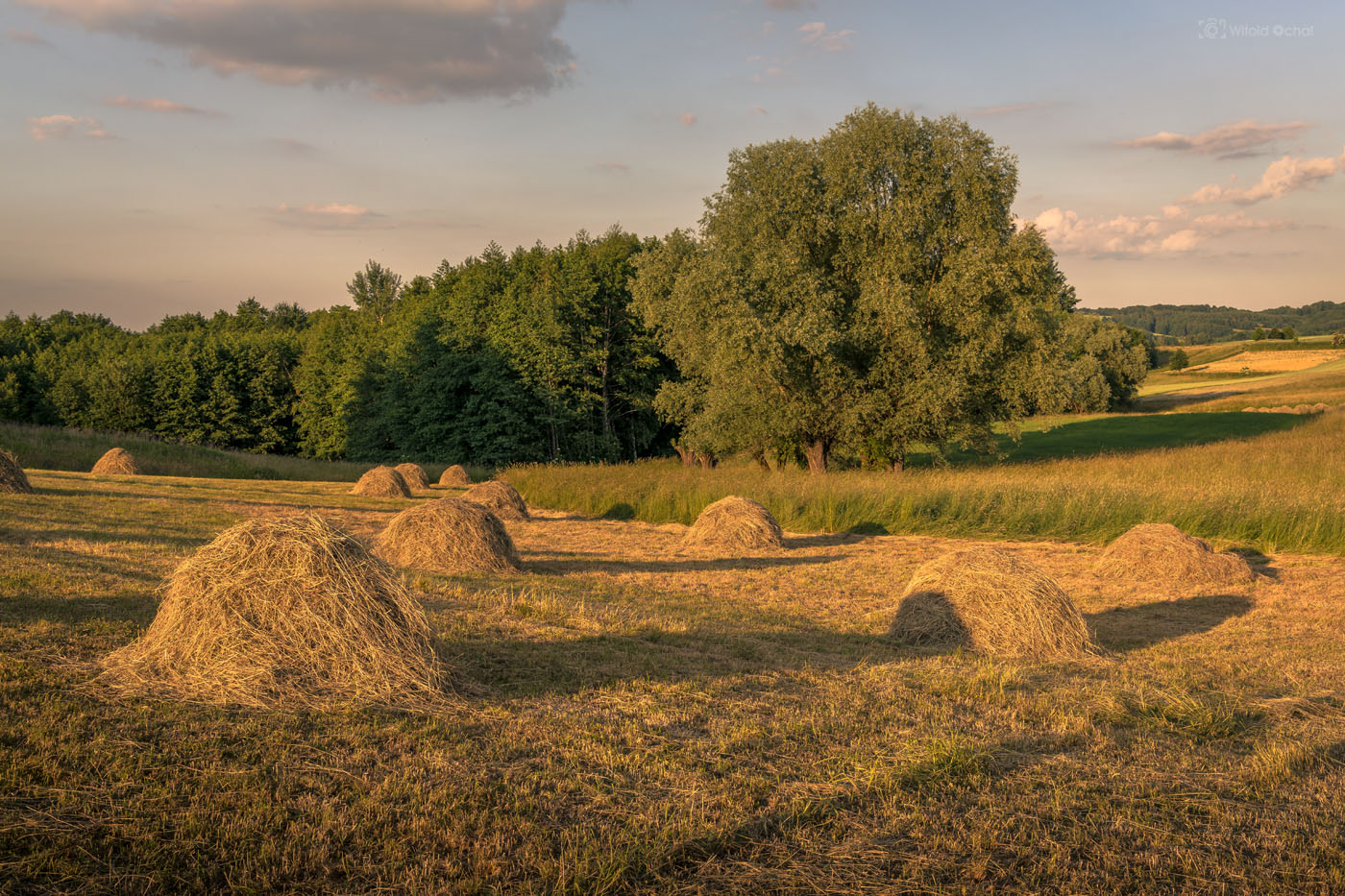 Dziś miało nie być chmurki na niebie, więc pomyślałem, że najpiękniej będzie, kiedy słońce wyjdzie już zza horyzontu i jego pierwsze promienie rozścielą się po okolicy. A wybrałem moją ulubioną dolinkę, gdzie mam niedaleko, a zawsze mogę liczyć na jakoweś malownicze kadry. Nie zawiodłem się – tu świeżo ścięta trawa, tam już zwałowana, w innym miejscu kopki siana. Nie było nudy, ale ja wybrałem do publikacji dwa zdjęcia.