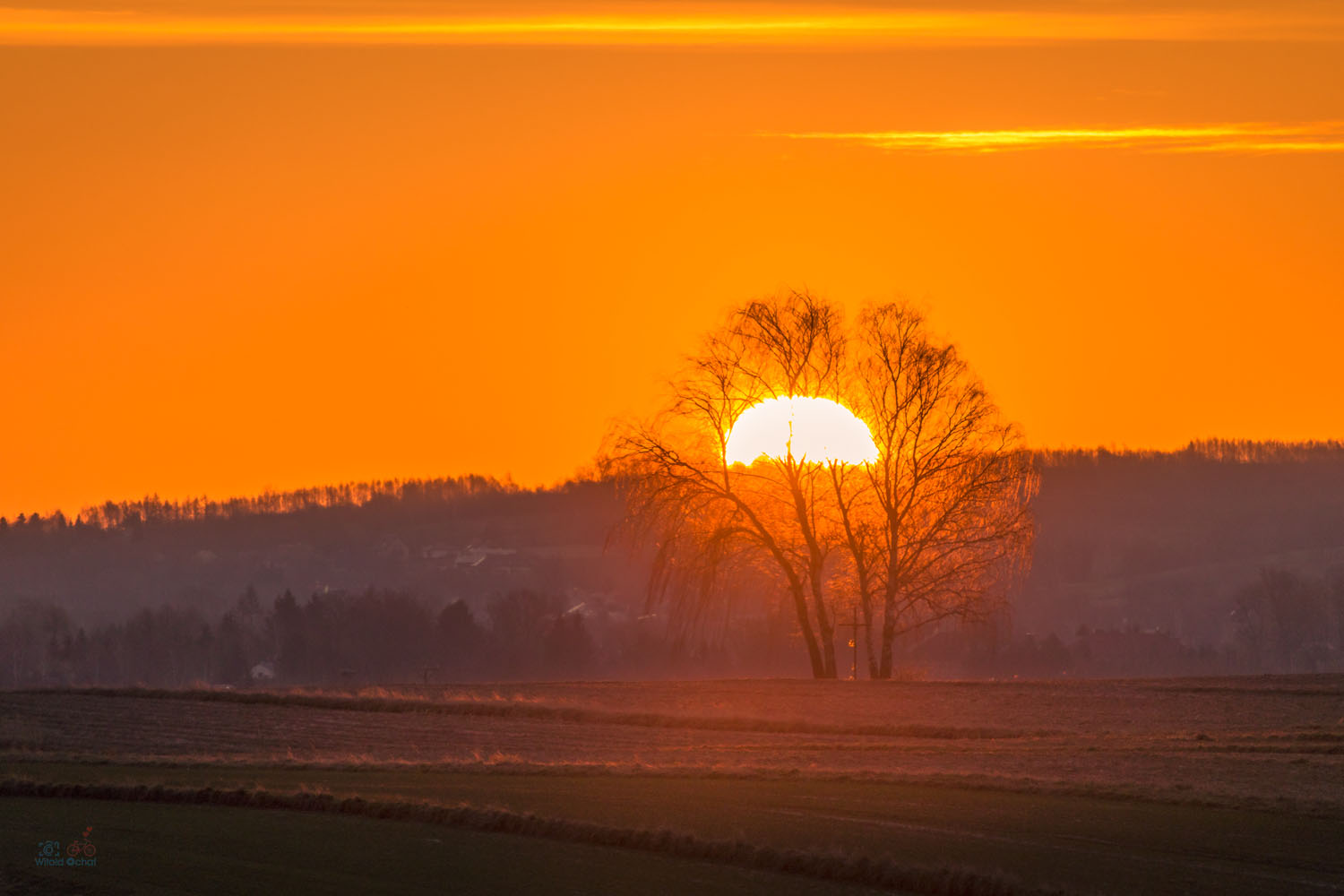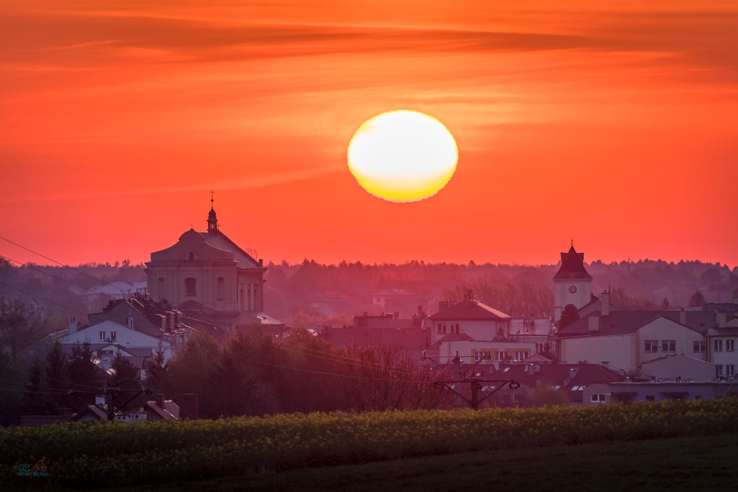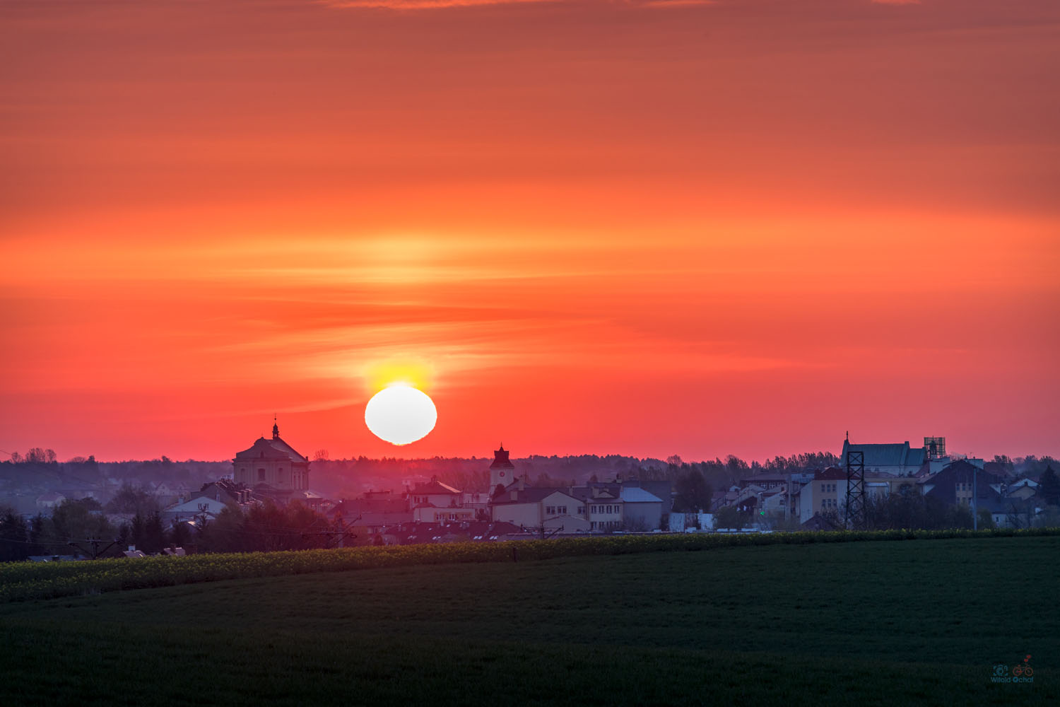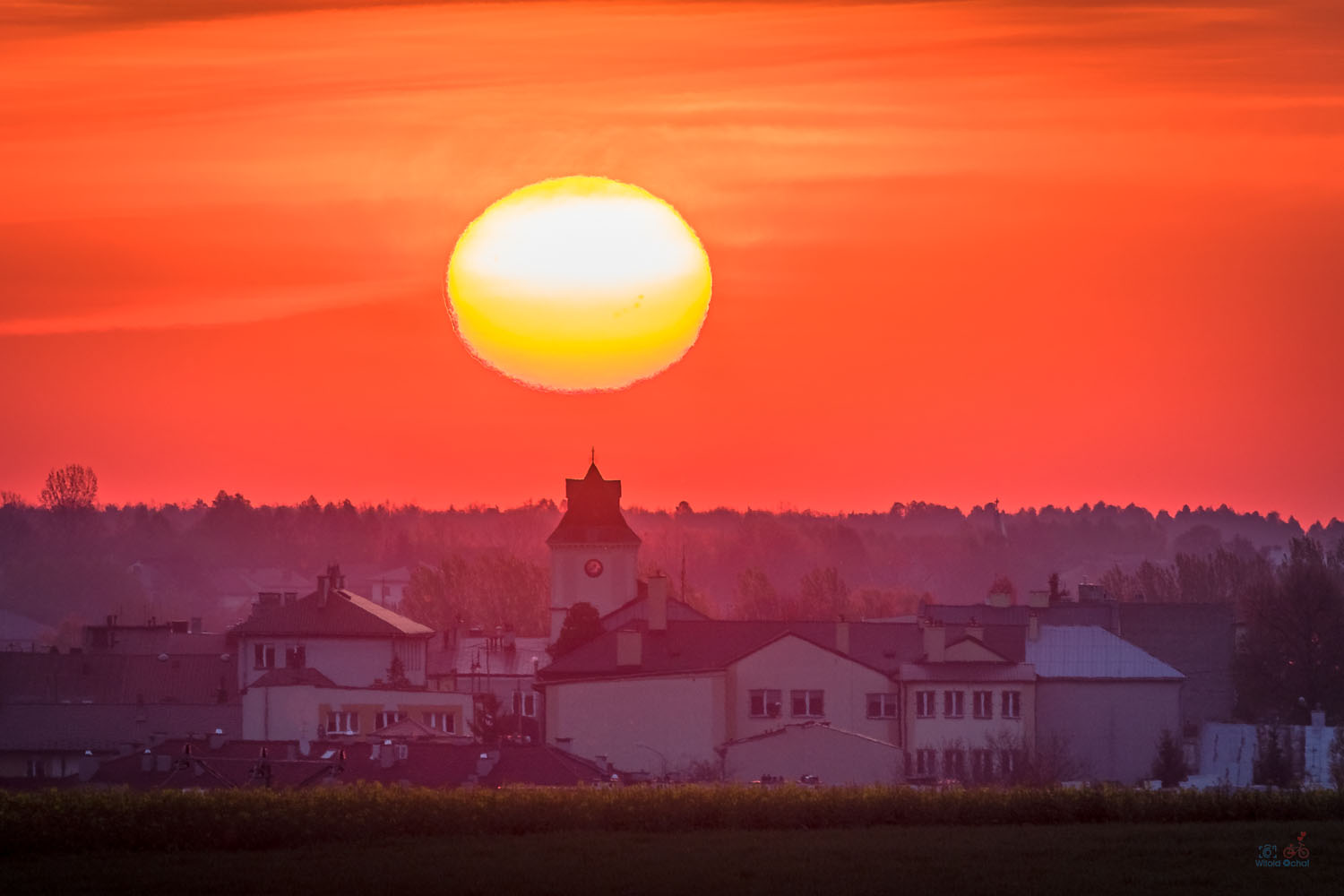 Wschodzące nad pobliskim miasteczkiem słońce. Motyw fotografowany przeze mnie wiele razy, a jednak za każdym razem inne warunki, inne kolory, inne dźwięki, inne zapachy… inne słońce. Tym razem uchwycone na cudownie pomarańczowym niebie. Niezbyt mocne, na początku nieco zniekształcone na skutek refrakcji atmosferycznej.