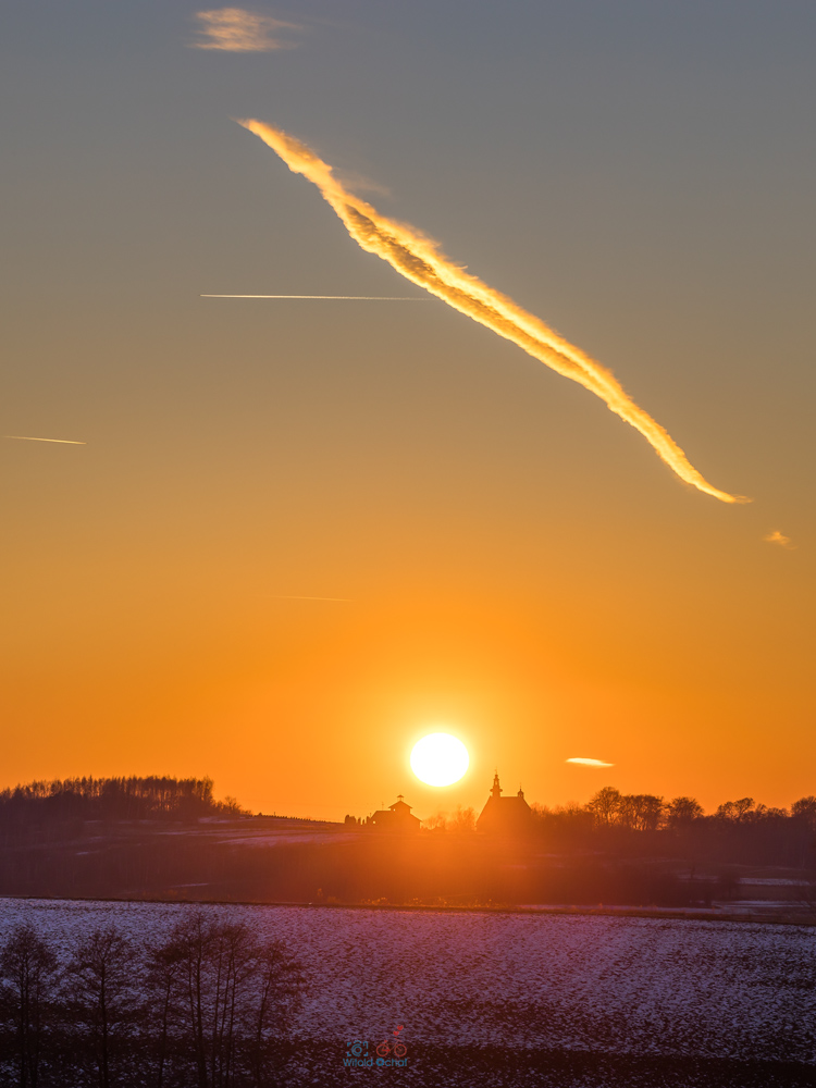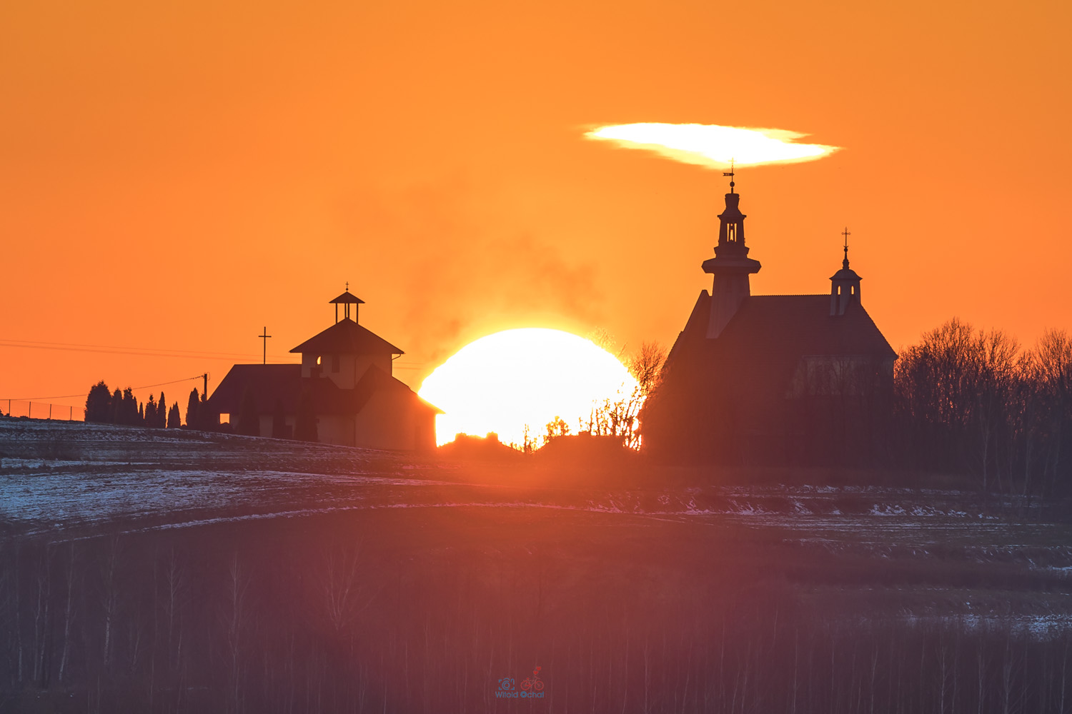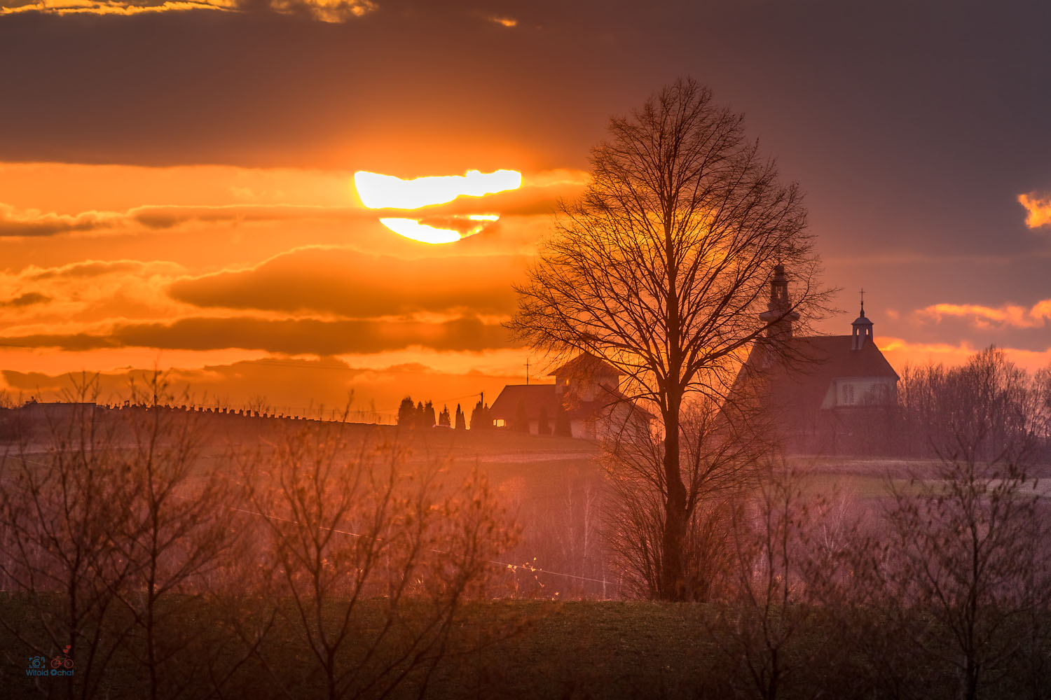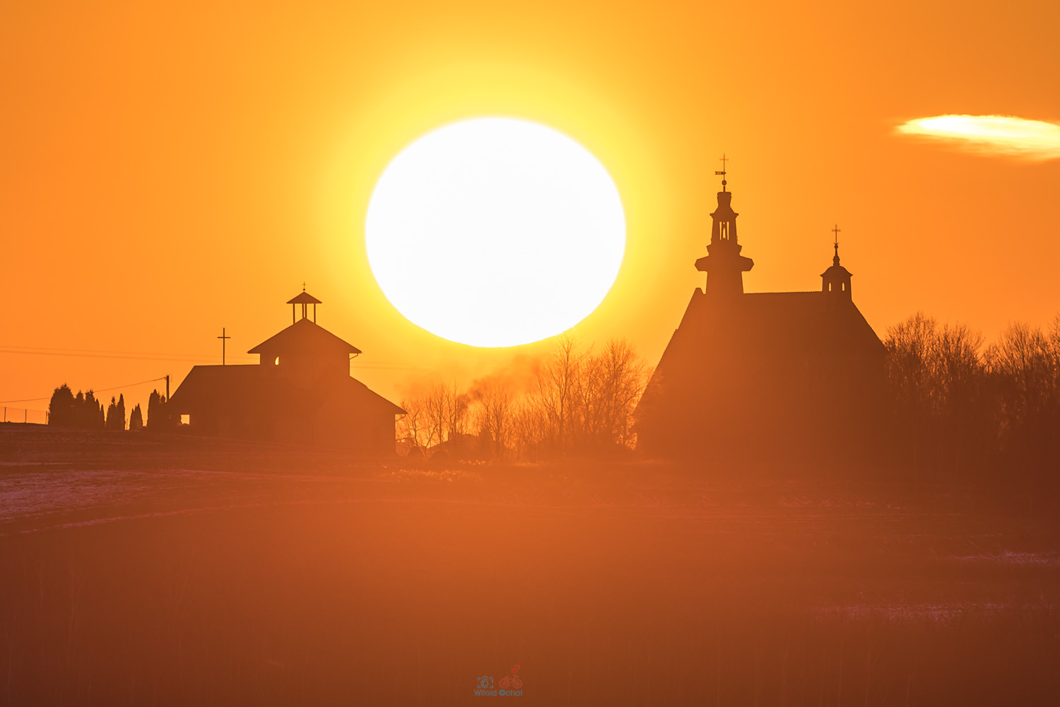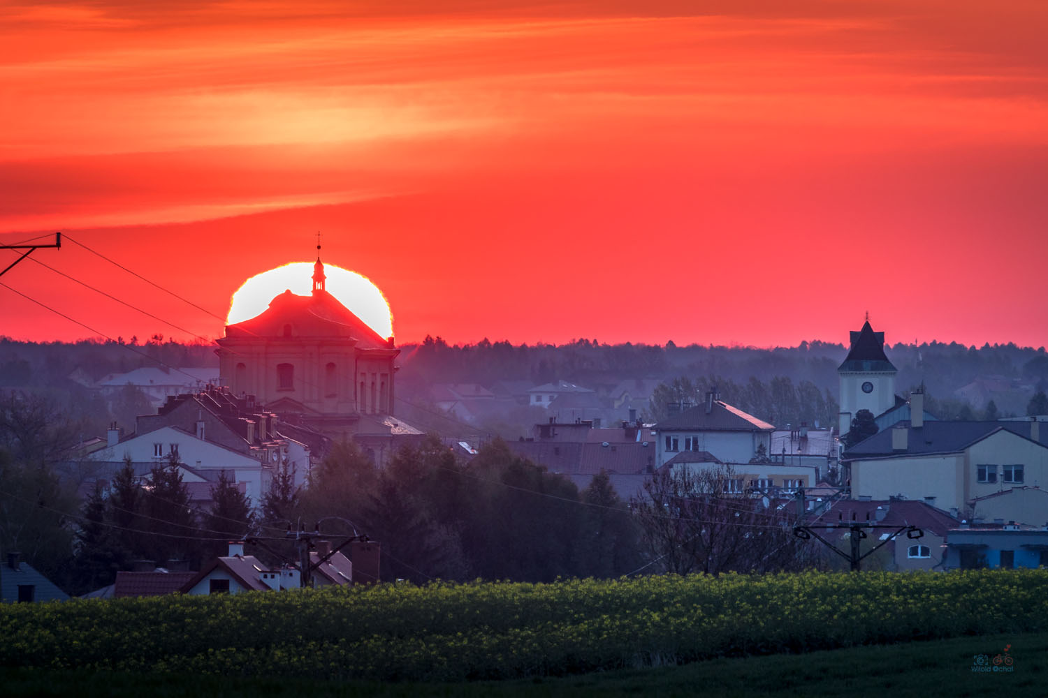 Wschodzące nad pobliskim miasteczkiem słońce. Motyw fotografowany przeze mnie wiele razy, a jednak za każdym razem inne warunki, inne kolory, inne dźwięki, inne zapachy… inne słońce. Tym razem uchwycone na cudownie pomarańczowym niebie. Niezbyt mocne, na początku nieco zniekształcone na skutek refrakcji atmosferycznej.