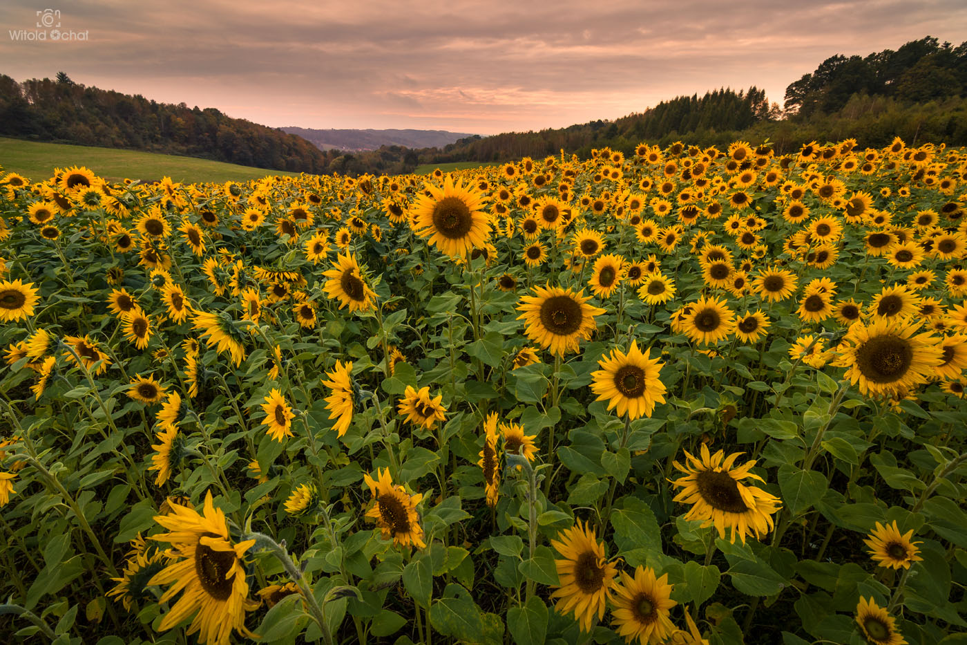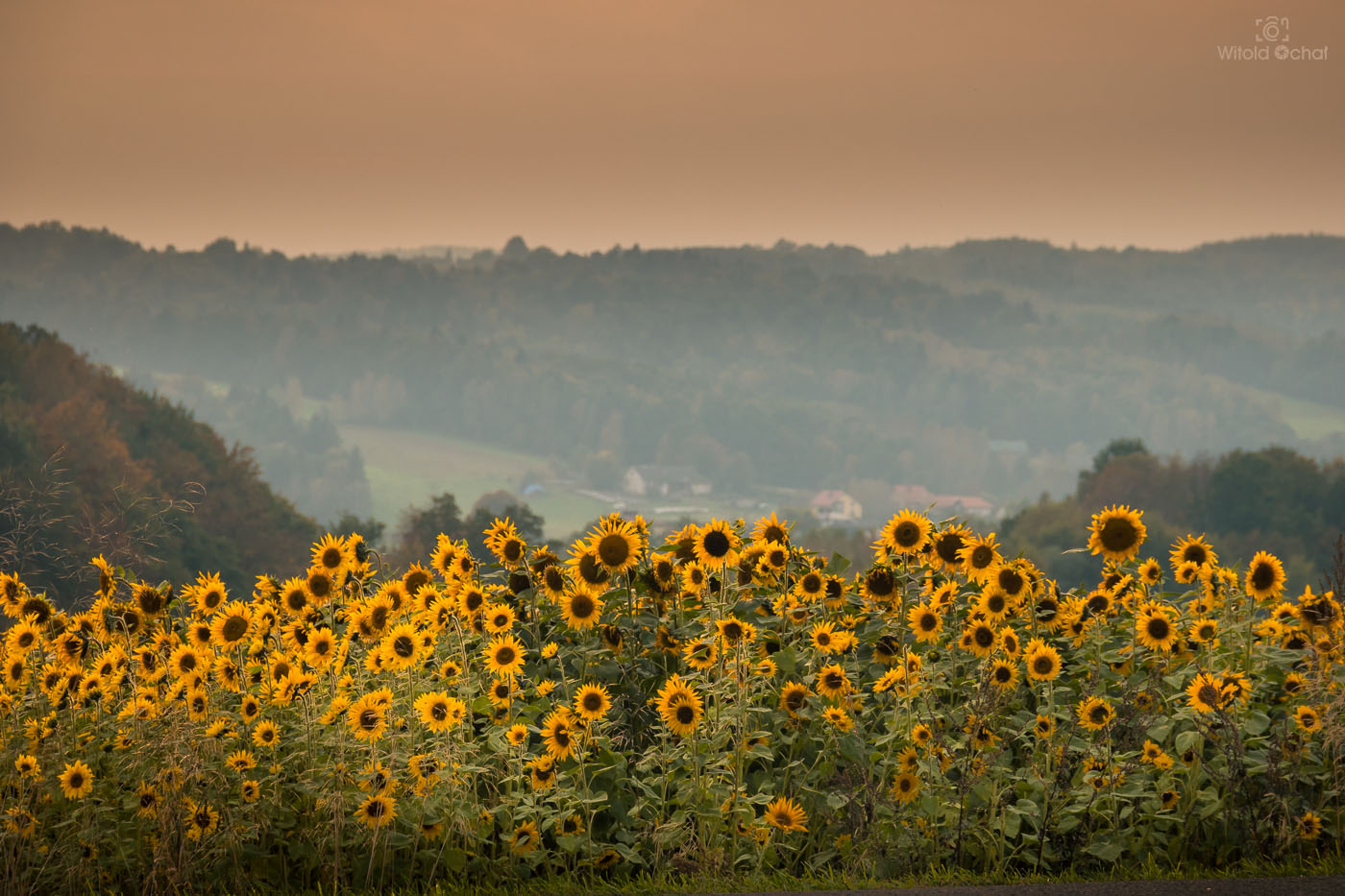 Wiele słoneczników rosnących na polach już dojrzało i nie wygląda atrakcyjnie, ale są i takie, zapewne posiane później, które nadal są w pełni rozkwitu. I na taką kępę trafiłem w sobotni poranek. Słońce dopiero co zaczęło muskać je swoim światłem, co skutecznie utrudniała mu nisko wisząca mgiełka. Dzięki temu zdjęcie wyszło niczym namalowane akwarelą.