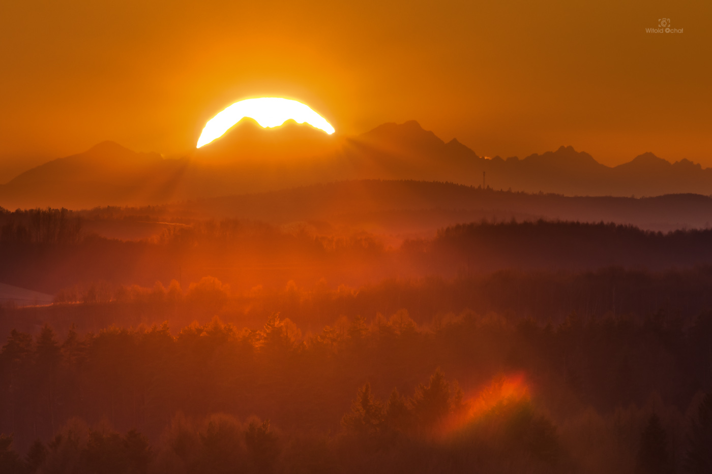 Poniżej spaktakl, który przy dobrej widoczności mogę próbować dostrzec przez około dwa miesiące w roku. Prognozy nie były łaskawe, ale spróbowałem i oto mam – zachodząca kulka słońca za jednym z najwyższych szczytów Tatr – Łomnicą, odległą o dokładnie o 134 kilometry! Dodam tylko, że owe zjawisko zwane jest przez dalekoobserwatorów „gackiem” lub „nietoperzem” 🙂