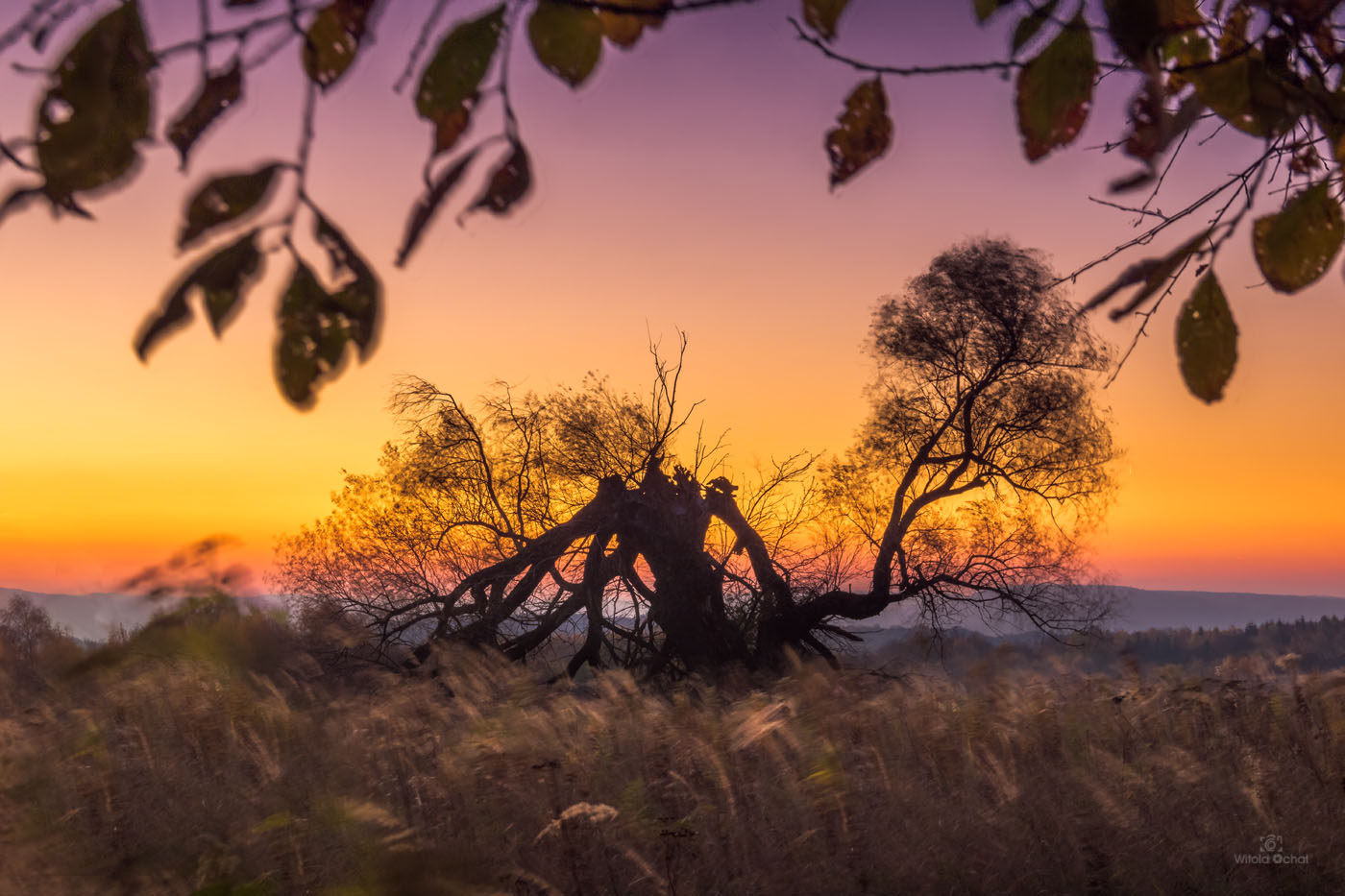 Musiałem przebiec jeszcze kilkaset metrów, aby uwiecznić ten cudowny widok w pobliskiej dolince z samotnie rosnącą wierzbą. Wydawało mi się, że nie biegnę, a lewituję kilkadziesiąt centymetrów nad ziemią. Jedynie rozstawianie statywu utwierdzało mnie, że jednak stąpam po ziemi. Odcienie zmianiały się z minuty na minutę. Purpura świeciła może cztery, może pięć minut. Kiedy ocknąłem się z fotograficznego letargu byłem już pod samym drzewem, a niebo zrobiło się szare.