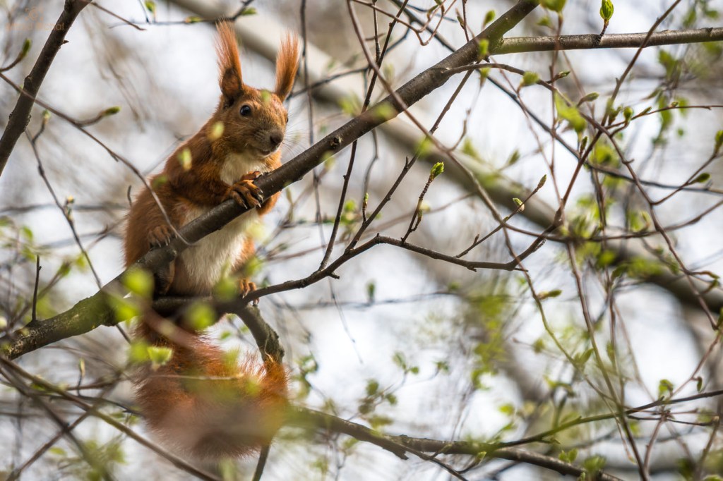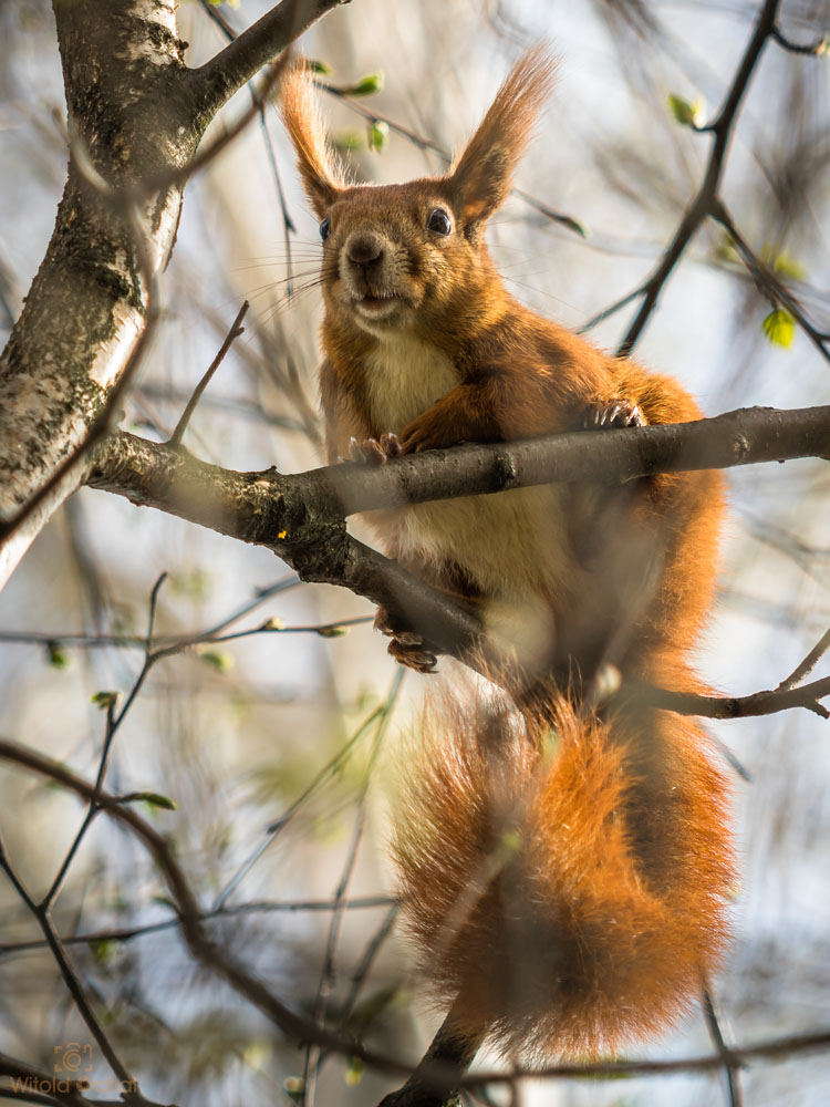 Siadłem więc sobie i czekałem grzecznie, aż zechce zejść z wysokiego jesionu i zapozować. Moja cierpliwość została w końcu nagrodzona. Wiewiórkowi znudziło się i zszedł na dół. Przysanął chwilkę na jednej z gałęzi, po czym hycnął w tuje i tyle go widziałem.