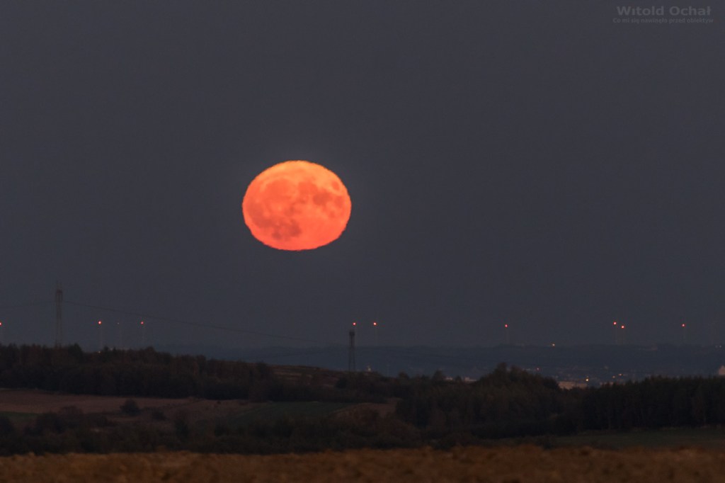 Nie byłbym sobą, gdybym nie skorzystał z kolejnej okazji do sfotografowania „różowego” Księżyca. Dzisiaj wschodził ponad pół godziny po zachodzie słońca. Było już niestety bardzo ciemno i warunki do fotografowania trudne. No ale kto, jak nie ja 🙂 Miejscówkę znalazłem kilka dni temu. Odległość do kościoła to 2,5 kilometra. Do Księżyca 364500 kilometrów.