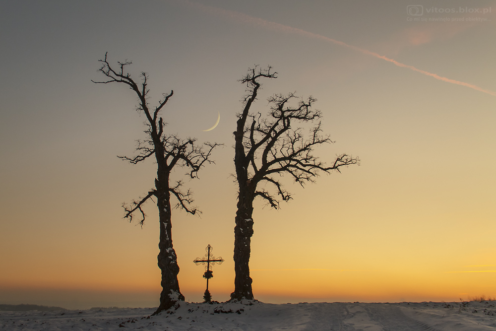 Pierwszy dzień Nowego Roku i od razu takie okoliczności przyrody. Oby sprawdziło się powiedzenie, że „Nowy Rok jaki, cały rok taki”. Niebo bez jednej chmurki o zachodzie przybrało żółto pomarańczowy kolor. Do tego dwie samotne akacje z przydrożnym krzyżem pamiętającym przedwojenne czasy. Cieniutki sierp księżyca tuż po nowiu. Tylko siarczysty mróz trochę doskwierał, ale to już szczegół.