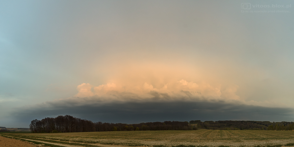 Wypatrzyłam ją na radarach, jak była jeszcze daleko ode mnie. Miałem nadzieję, że zdąży dotrzeć do mojej okolicy przed zachodem słońca. Dotarło samo czoło burzy, a zdjęcie zrobiłem punktualnie o zachodzie słońca. No to sezon burzowy rozpoczęty!