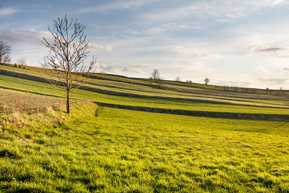 Jeden z wczesno wiosennych zachodów słońca. Ten czas, kiedy ptaki dopiero zaczynają doppiero swoje trele. Pola dopiero powoli zaczynają się zielenić. Jest nieco cieplej i chce się spacerować po moich bezdrożach w nadziei na piękny zachód słońca.