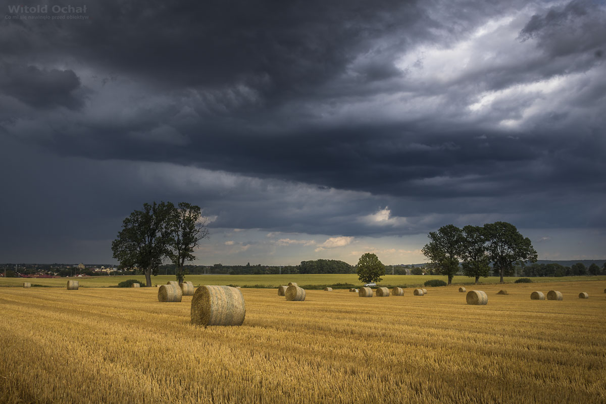 Wczorajszy wieczór zaskoczył mnie kolorami. Tak naprawdę wybrałem się już po osiemnastej, ale na przeciw burzy, która szła w moim kierunku. Burza nie doszła, ale trafiłem w cudowne miejsce. Wzgórze, bele słomy i ta przestrzeń przede mną skąpana w słonecznych promieniach. Wyczekałem na ten moment, kiedy światło będzie najpiękniejsze i oto powstał poniższy kadr.